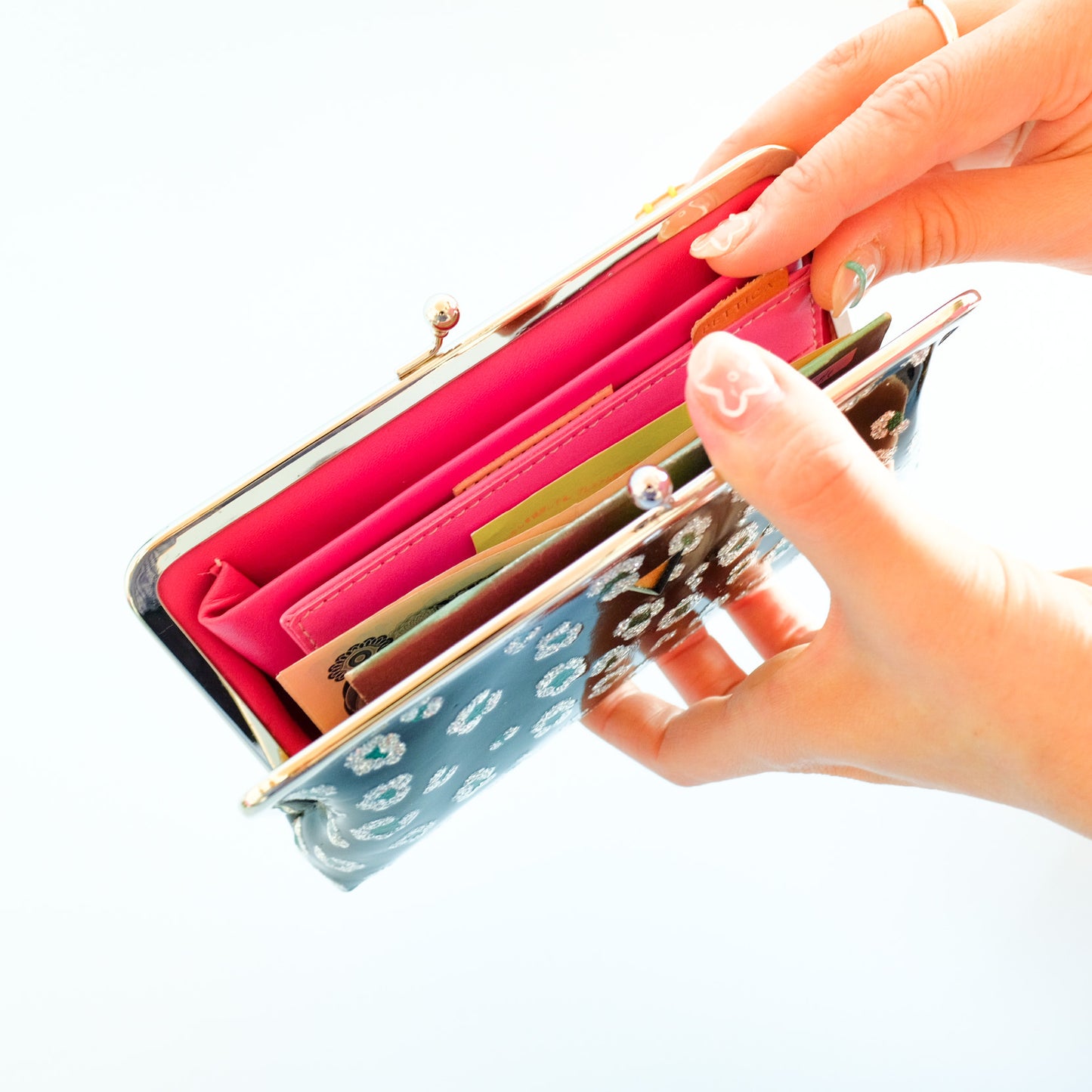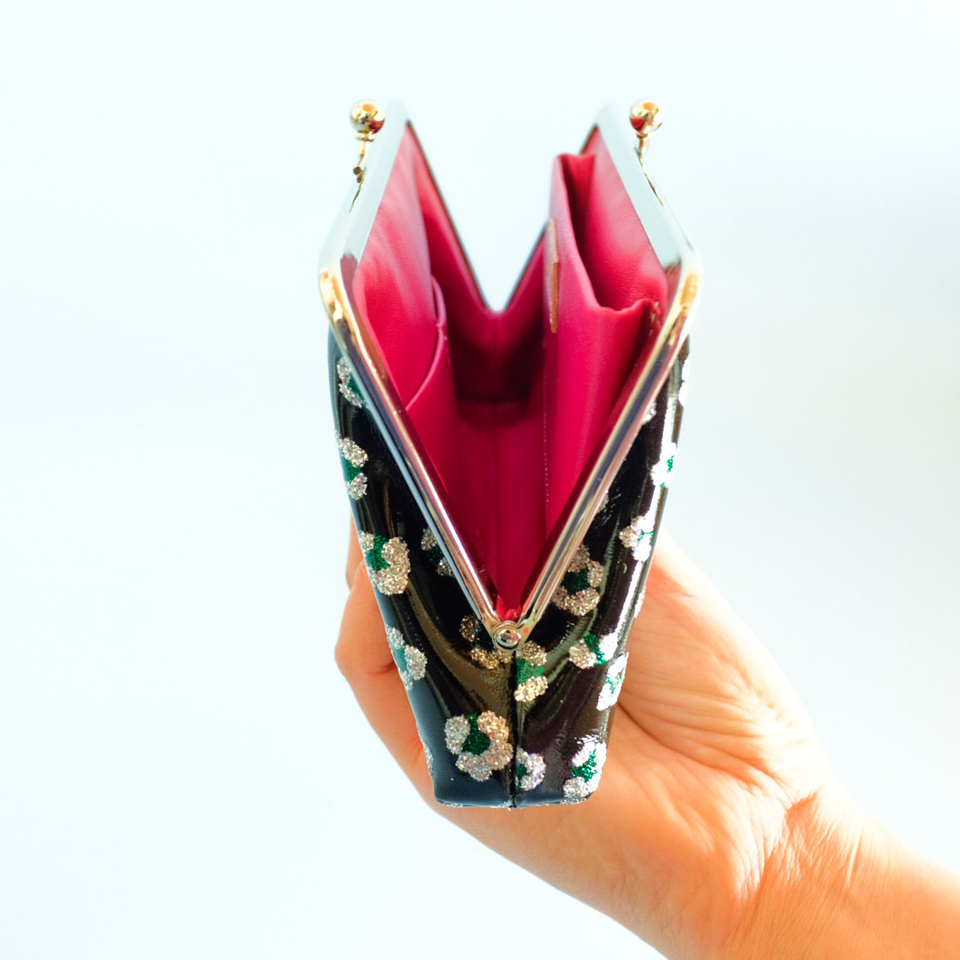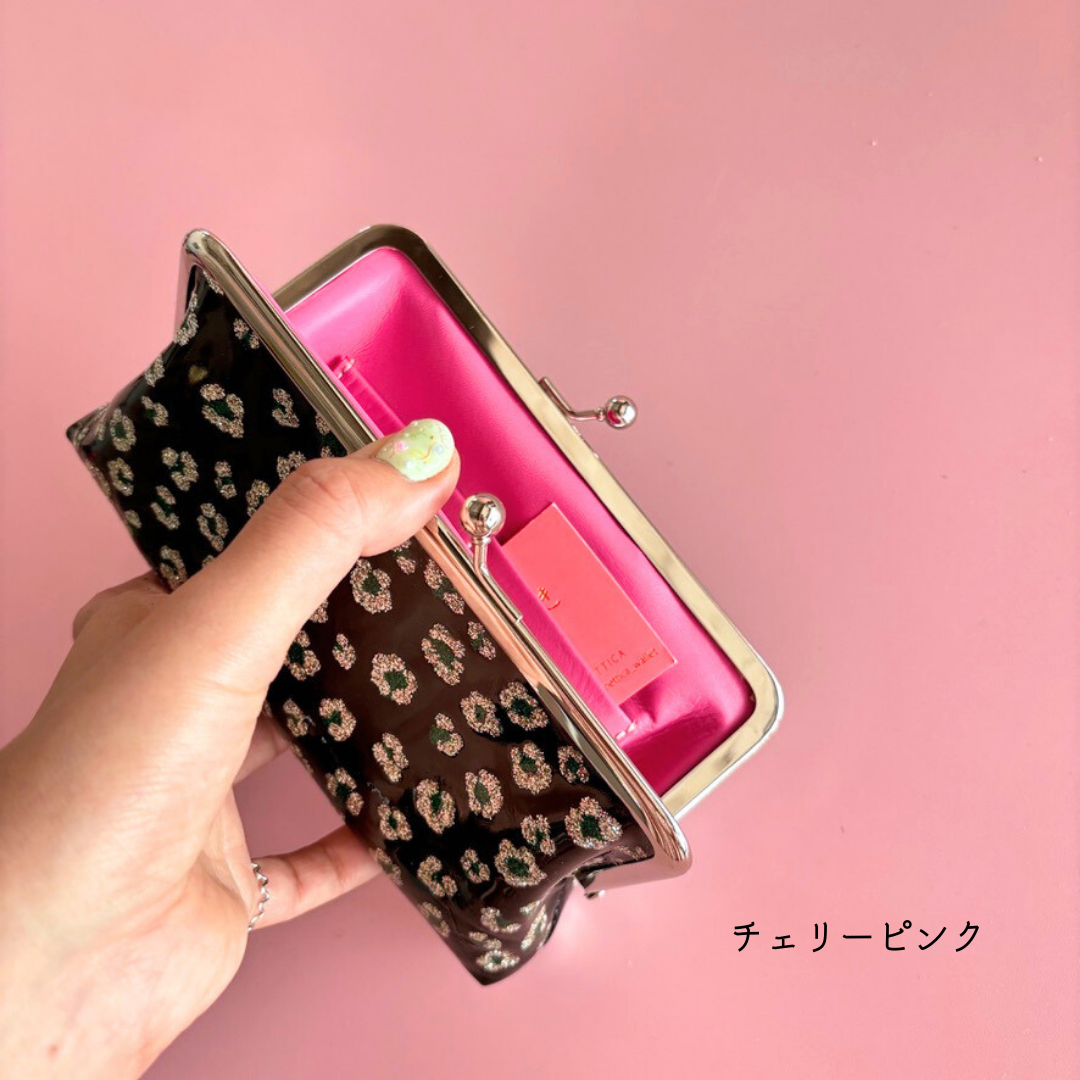 持っている手を綺麗に見せてくれるだけでなく、がま口を開いた時に覗くピンク色が、グッとセンスの良さを伺わせてくれる気がします。