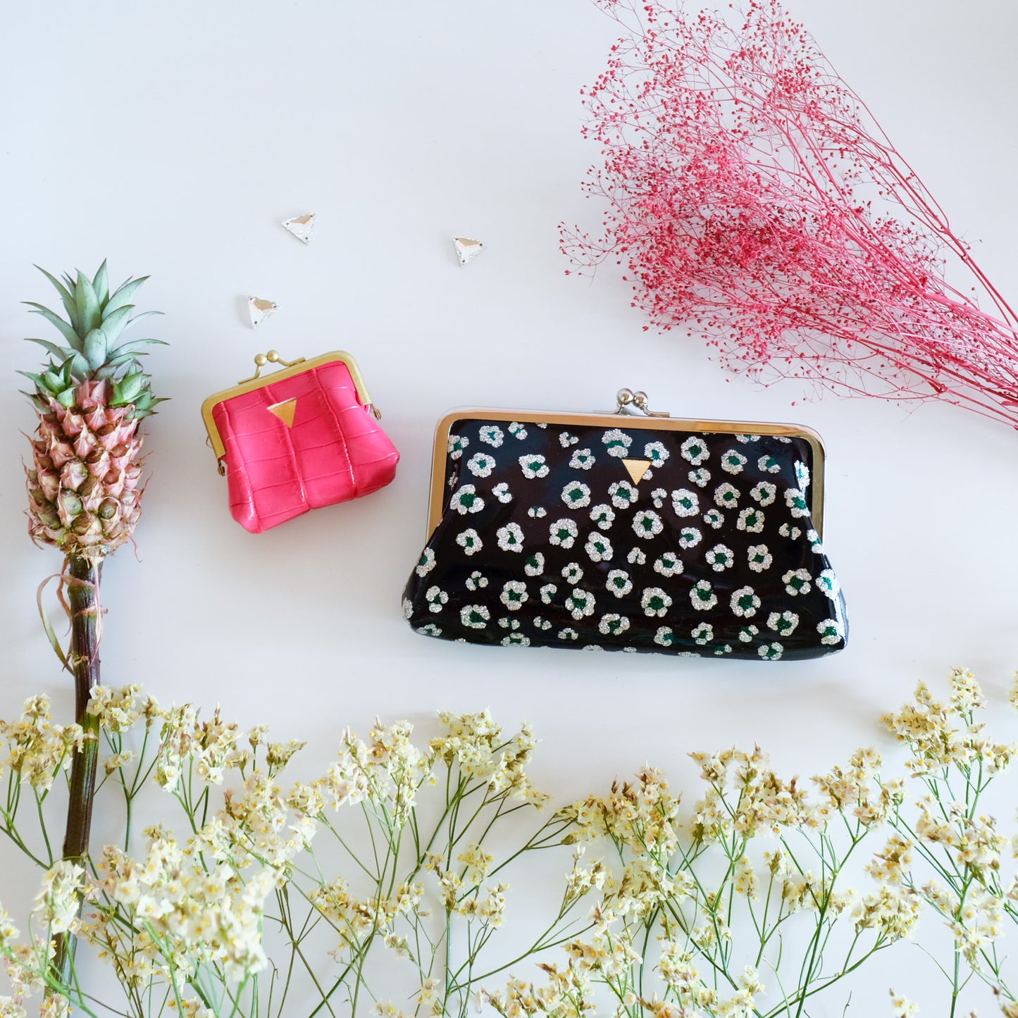 ラメのお花にエナメル加工という、高級感と可愛さを兼ね備えた革の質感が大好きです。